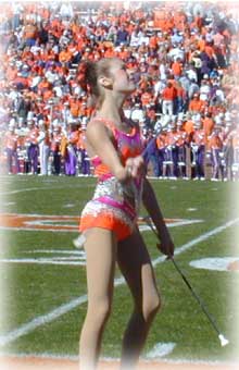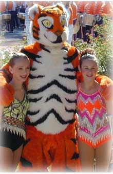 | Jordan had a great opportunity when she was invited to twirl at one of Clemson University's football games. It didn't take her too long to feel right at home -- and her costume was a perfect match! She's pictured at bottom with the Clemson Tiger and MacKenzie, a friend from Nationals. | |