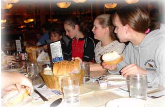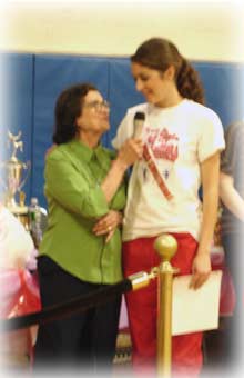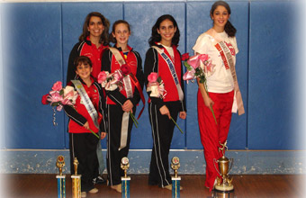 Top: group shot - Katie, Chrissy, Nadine, Alison, Jordan, Arielle, Danielle, Devin, Alyssa; in gowns - Alicia and Devin Middle: top winners for the day - Alyssa with Major Margie, receiving the college scholarship; Coach Tracey with Olivia, Jordan, Alison and Alyssa Bottom: One way to celebrate a terrific day, dinner at the Chateau with friends from the Belchertown Twirlers! |
