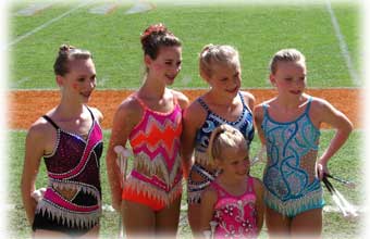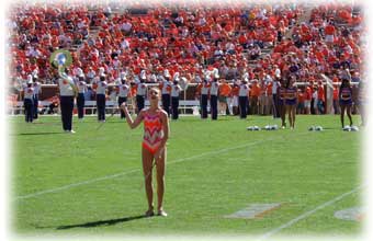 | For the second year Jordan made the cut during the Tiger Twirler for a Day Clinic at Clemson University. Not only did she twirl during tailgating with all the other twirlers who attended the clinic (top right pic), but she was one of only a handful who were invited to twirl during halftime as well. Jordan just loves getting out on the field! | |