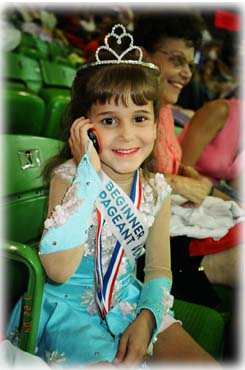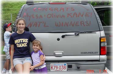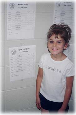 | What a year! Strutters Emma, Olivia and Alyssa, with Coach Tracey, had another successful year at America's Youth on Parade, NBTA Nationals at Notre Dame University. Olivia is shown next to her Beginner Tiny Tot Strut posting. Alyssa is in front of the blue curtain for the National Majorette Championships, where she made the Top-Twenty Semi-Finals. Emma is shown waiting to hear the announcements of the Intermediate National Pageant. Little Olivia made several calls after her Beginner Pageant Win. Sisters Alyssa and Olivia (and brother Alex in the background) had fun decorating the Honda for the trip home. | |