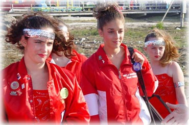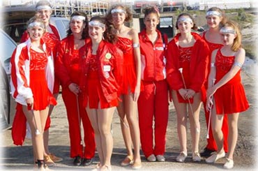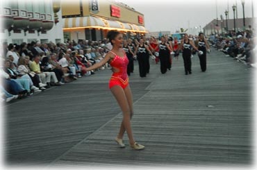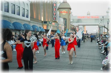 | Members of the Strutters marched in the Show Us Your Shoes Parade, part of the Miss America Pageant's week of festivities. They were invited to participate with Villanova University, their sister corps--Star Attraction, and campers from the Villanova Baton Camp. Senior Strutters Alyssa, Nadine, and Emma had a THRILLING experience, in spite of dealing with the tail end of Hurricane Isabel!! | |